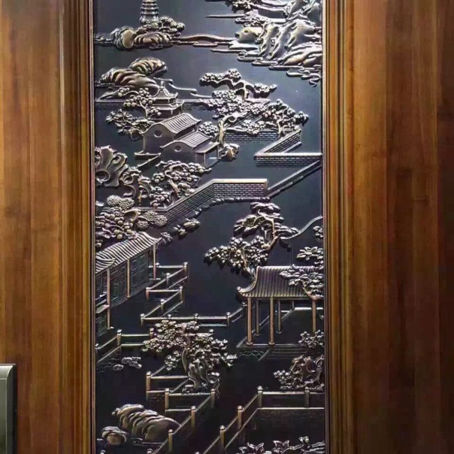 純銅純鋁雕刻屏風(fēng)背景墻,銅浮雕壁畫以其特有的金屬性質(zhì),解決了木制品的缺點(diǎn),能夠經(jīng)受戶外的風(fēng)吹雨淋而不變質(zhì),能夠有效的防火防潮防蟲蛀,好的耐候性,10年不變色。純銅雕刻屏風(fēng)背景墻,銅鋁浮雕壁畫經(jīng)過精雕細(xì)琢,既呈現(xiàn)出現(xiàn)代氣息,又不失古典韻味,融中西文化于一體,呈現(xiàn)出古典與現(xiàn)代的美感。