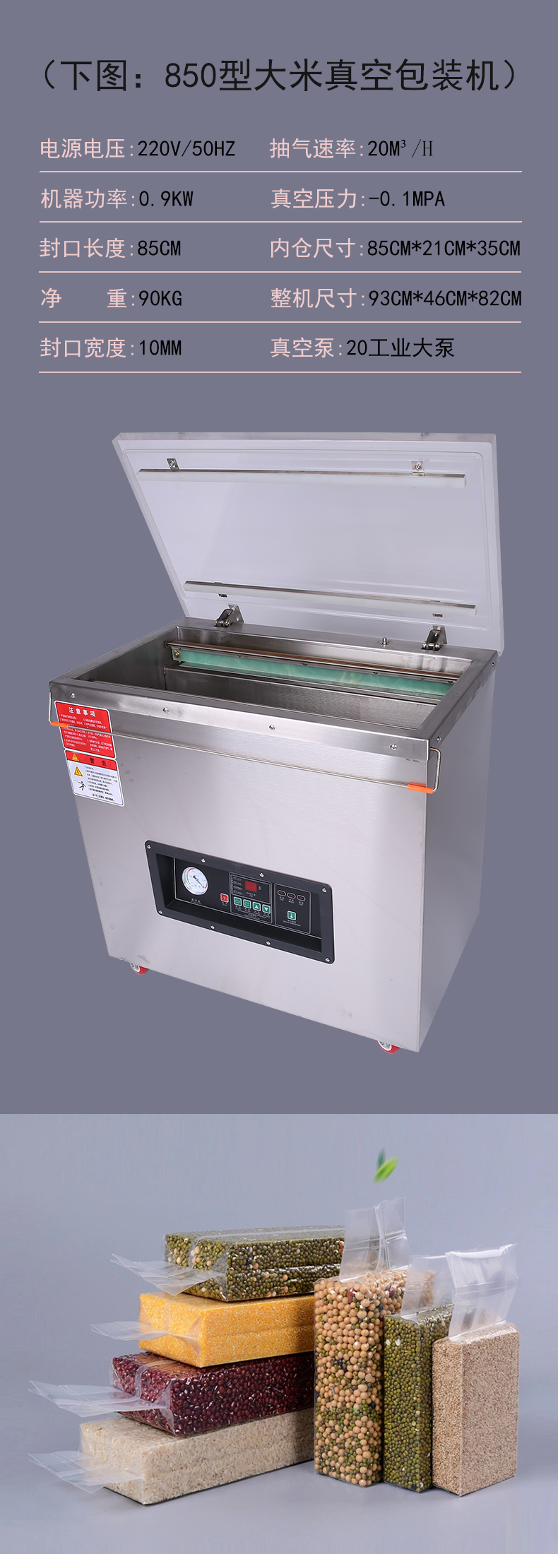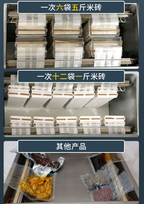 大米米磚真空包裝機(jī) 武漢大米米磚真空包裝機(jī)是加深型直空包裝機(jī),自帶有多種不同大小的米磚模具,直空句裝后可以延長(zhǎng)產(chǎn)品的保質(zhì)期,起到耐氧化、防蟲蛀、霉變、防受潮等功能,是一款專為直空包裝大米米磚的機(jī)型產(chǎn)品。該直空包裝機(jī)是中小型大米生產(chǎn)廠家直空包裝的*機(jī)型。