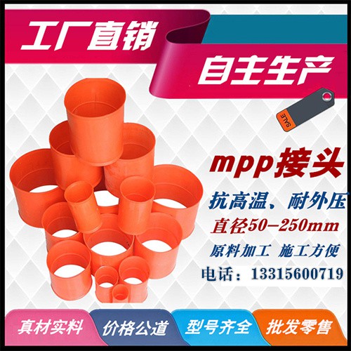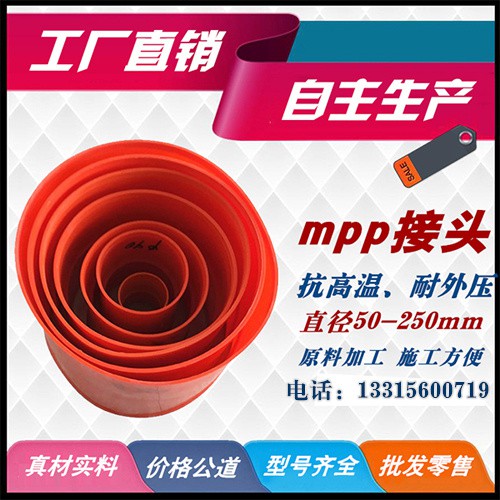 MPP電力管接頭: MPP電力管接頭是由MPP*加工而成,主要起到連接MPP電力管CPVC電力管的作用,它省卻了原有的電力管的笨重連接和熔接。減少了工作時間**了工作效率。 電力管接頭規(guī)格:50#、63#、75#、90#、100#、110#、110#、116#、125#、140#、150#、160#、167#、175#、180#、185#、192#、200#、203#、210#、219#、216#、225#、235#、250#、315#